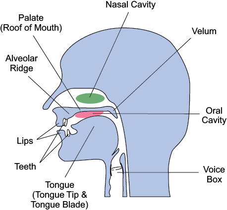 Humans have all the same organs in the mouth and throat that the other great apes have, but the larynx, or voice box (you may know it as the Adam’s apple), is in a lower position in the throat in humans. This creates a longer pharynx, or throat cavity, which functions as a resonating and amplifying chamber for the speech sounds emitted by the larynx. The rounding of the shape of the tongue and palate, or the roof of the mouth, enables humans to make a greater variety of sounds than any great ape is capable of making (see Figure 2.5).