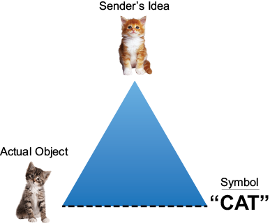 Symbols have three distinct qualities: they are arbitrary, ambiguous, and abstract. Notice that the picture of the cat on the left side of the triangle more closely represents a real cat than the word “cat.” However, we do not use pictures as language, or verbal communication. Instead, we use words to represent our ideas. This example demonstrates our agreement that the word “cat” represents or stands for a real cat AND our idea of a cat. The symbols we use are arbitrary and have no direct relationship to the objects or ideas they represent. We generally consider communication successful when we reach agreement on the meanings of the symbols we use (Duck).