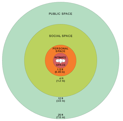 Figure 2.1. A diagram representation of personal space limits, according to Edward T. Hall’s interpersonal distances of man, showing radius in feet and meters. (By WebHamster – Own work, CC BY-SA 3.0)